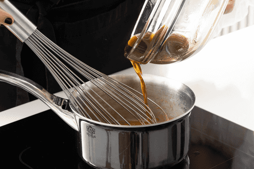 Then pour in the oil in a thin stream while stirring the mixture.