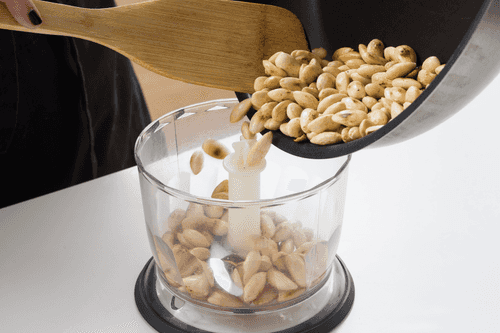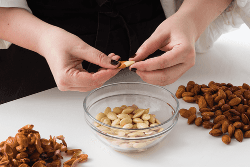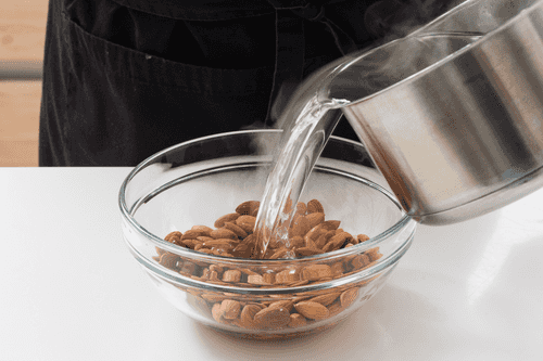 Pour boiling water over the almonds and let them sit for 5-10 minutes.
