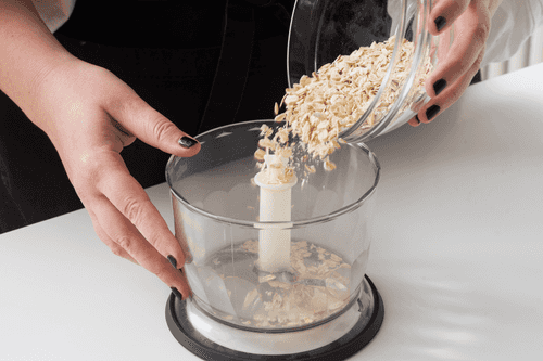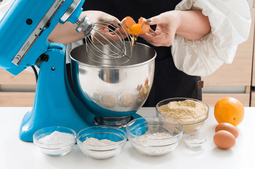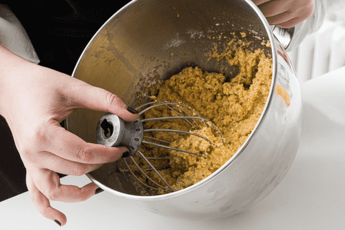 Mix almond and oat flour with wheat flour, add half of the powdered sugar, eggs, baking powder, a pinch of salt, and orange zest.