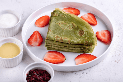 Add a little matcha tea to anything, and the dish will immediately acquire a Japanese character. A little matcha - and the pancakes turn green, and when strawberries appear, the picture on the plate becomes very colorful and juicy . Recipe from Maxim Fomenkov, chef of the restaurant "Uzory".