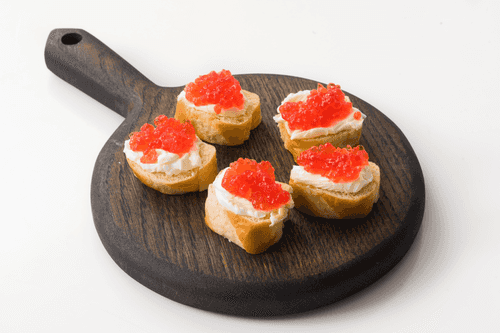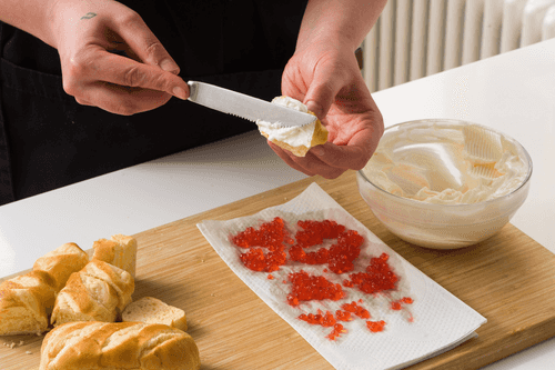 Spread cream cheese on a piece of brioche and top with fake caviar.