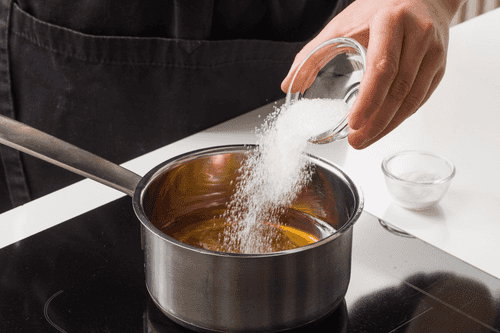 Then add a couple of drops of dye to achieve a red-orange color similar to salmon roe, and let it cool.