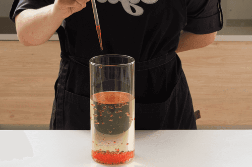 Use a pipette to drop juice into cold vegetable oil. Do this slowly so that the juice droplets have time to cool and solidify.
