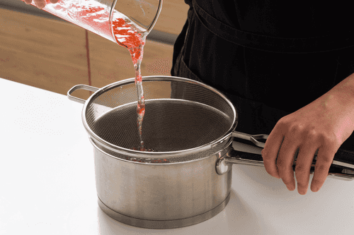 Strain the resulting caviar through a sieve; the oil can be used in other dishes, and the caviar should be placed on a paper towel to remove the oil.