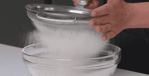 For the test, sift 500 g of flour and 100 g of powdered sugar into a large bowl.