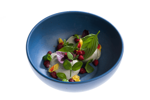 Place the prepared mousse on a plate and decorate with strawberries and basil and mint leaves.