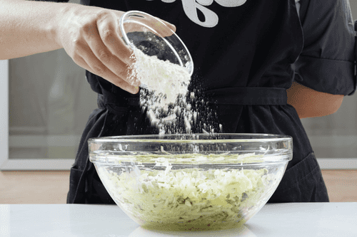 If you have time, you can salt them and leave for 10 minutes instead of squeezing; they will release excess moisture. If there's no time, immediately drain in a colander and squeeze well, gathering the pulp in handfuls.