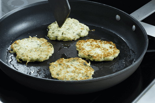Heat vegetable oil in a pan. Spoon the dough into pancakes, leaving space between them.