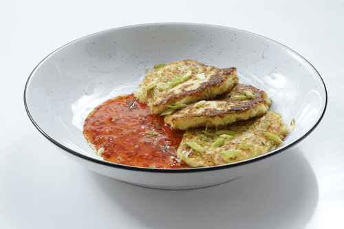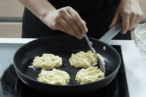 Heat vegetable oil in a pan and spoon the batter into pancakes, spaced apart.