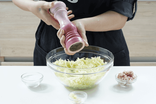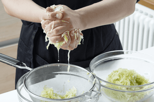 If there is time, you can salt them and leave for 10 minutes instead of squeezing; they will release excess moisture. If there is no time, immediately drain in a colander and squeeze well, gathering the pulp in handfuls.
