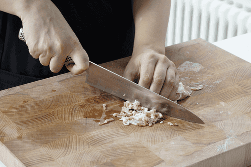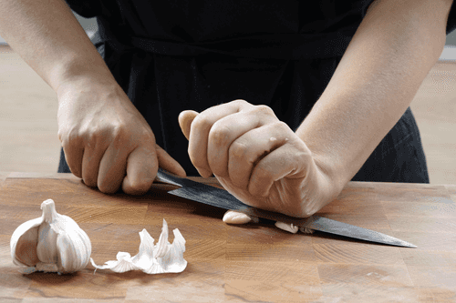 Peel the garlic, crush it with the flat side of a knife, and chop it.