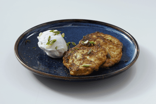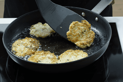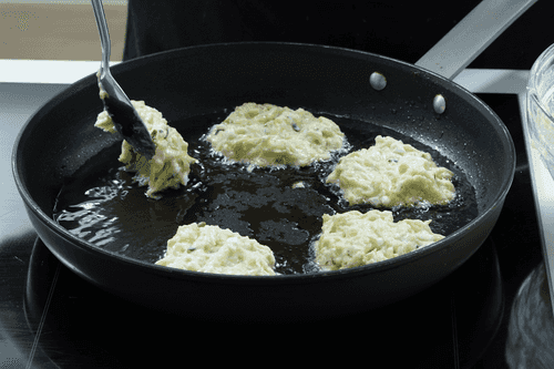 Heat vegetable oil in a pan and spoon the batter into pancakes, spaced apart.