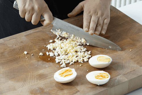 Boil 2 eggs hard, peel, chop finely (as for pies) and set aside.