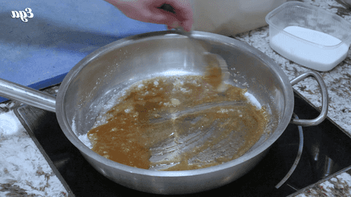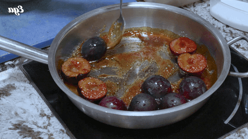 Place the plums cut side down on melted sugar, caramelize for 1.5 minutes, then flip the plums and caramelize for another 1.5–2 minutes.