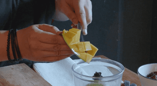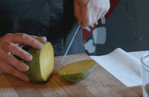 Remove the skin from the cut part of the mango and place the flesh in the same blender.