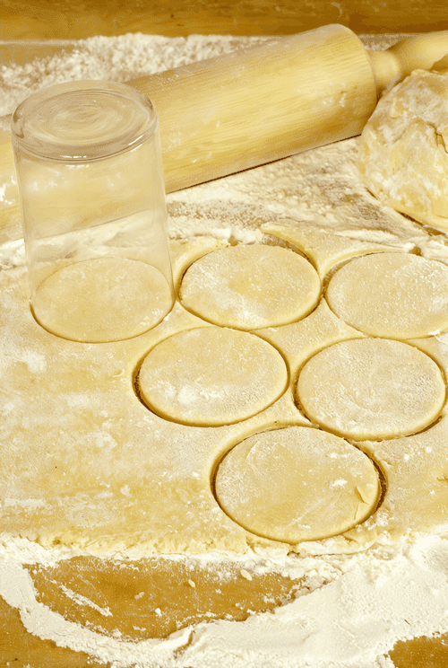 Roll out the dough to a thickness of about 1/2 cm and cut out circles using a round cutter or a glass.