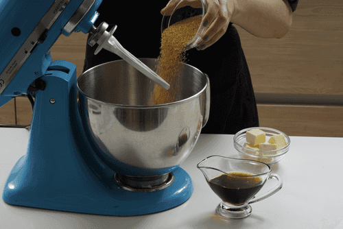 Beat 85 grams of room temperature butter, brown sugar, and maple syrup until smooth. It's better to use the 'paddle' attachment.