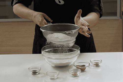 Sift flour, cocoa, baking powder, ginger, cinnamon, cloves, salt, and pepper into a bowl.