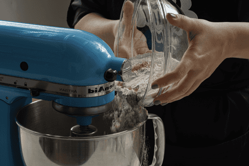 Reduce the mixer speed and add the dry mixture to the oily one.