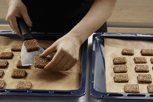 Line two baking trays with parchment paper. Place the gingerbread dough pieces 2 cm apart. Bake for 10 minutes at 180 degrees. In the middle of the cycle, swap the trays to ensure even baking.