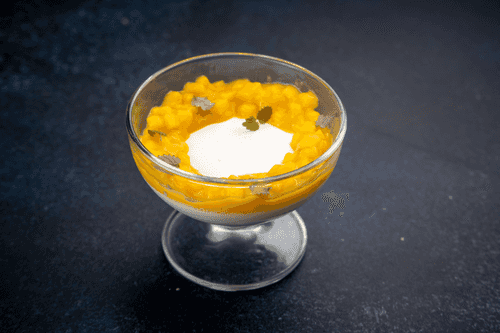 Pour the tropical sauce with fresh mango over the set panna cotta.
