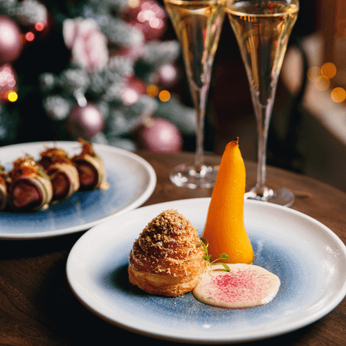 Drunken pear with cruffin and gorgonzola mousse is an exquisite dessert with a refined taste and rich texture. The origins of this dish trace back to European gastronomy, where wine-soaked fruits are valued for their complexity and aroma. The pear soaked in white wine and spices acquires a subtle spicy note, while the delicate gorgonzola mousse adds a savory creamy depth. The cruffin made from airy puff pastry with caramelized nuts complements the composition with a crunchy texture. The final touch is freeze-dried raspberry, highlighting the sweet-sour contrast. This dessert is for those who appreciate harmony of flavors and an experimental approach in cooking.