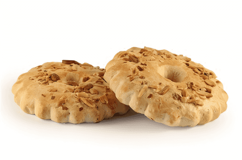 Place the obtained rings on a sheet, brush with beaten egg white, sprinkle with chopped almonds or peanuts, and put in the oven for 10-15 minutes to bake.