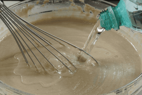 Pour in 1/3 mineral water and 25 ml of vegetable oil, mix the dough until there are no lumps. Let the dough rest for 20 minutes.