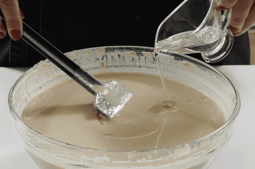 Add 25 ml of vegetable oil and mix the dough again: it's important not only to avoid lumps but also not to release gas bubbles due to overly thorough mixing. It's easiest to do this with a silicone spatula.