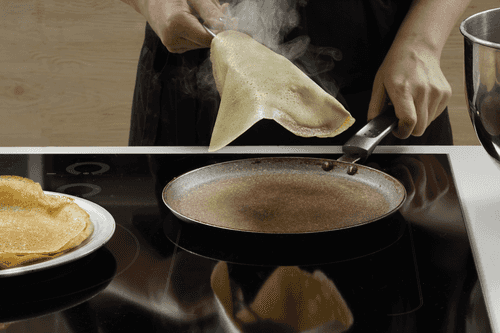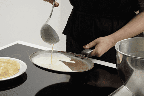 Preheat the pancake pan well, grease it with vegetable oil, pour a ladle of pancake batter onto it, and spread it over the entire surface of the pan.
