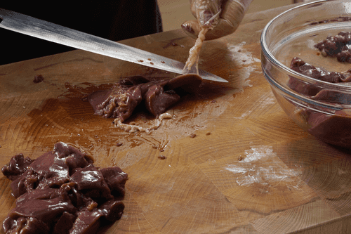 Clean the liver from ducts and blood clots. Cut the liver into small pieces.