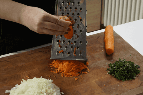 Chop the onion finely. Grate the carrot on a coarse grater. Chop the parsley finely.