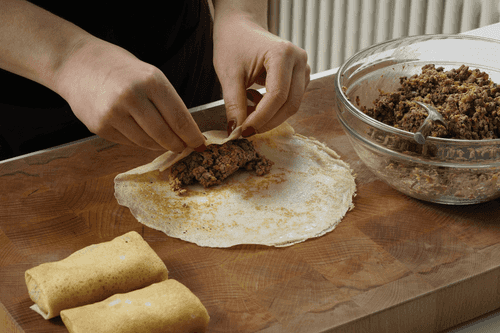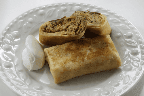 Place 1 tablespoon of filling on each pancake. Fold each pancake like an envelope.