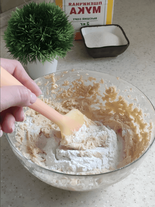 Carefully mix in the rice flour with a spatula. Sift the wheat flour beforehand and add salt to it. Introduce the flour into the dough gradually, as the gluten content may vary. The dough should be soft but not overly packed with flour.