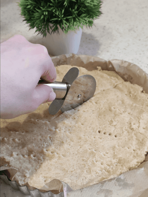 Flatten the dough across the entire diameter. It may stick and stretch, so you can sprinkle a little flour. Prick the dough with a fork and immediately cut it into 8 pieces.