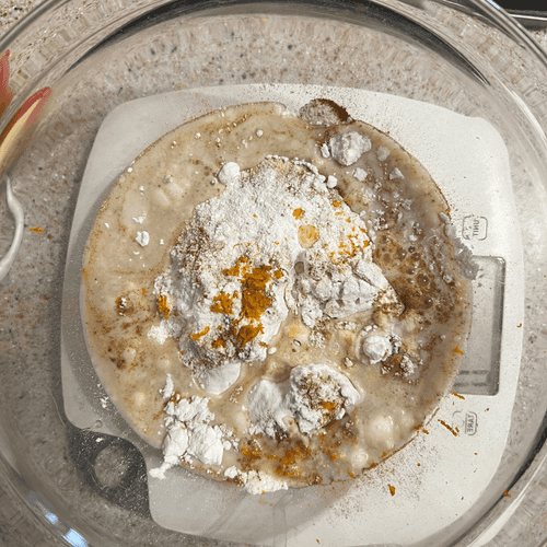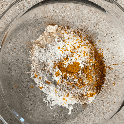 Grind millet into flour in a blender. In a bowl, mix the dry ingredients (rice flour, ground millet, spices, salt, and baking powder).