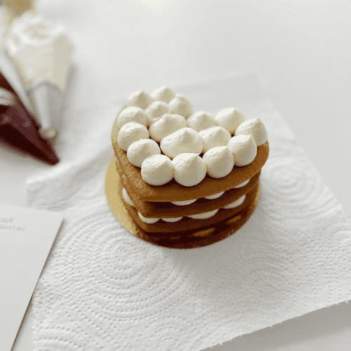 Assembly: place the first layer, cream, filling; place the second layer, cream, filling; place the third layer, cream.