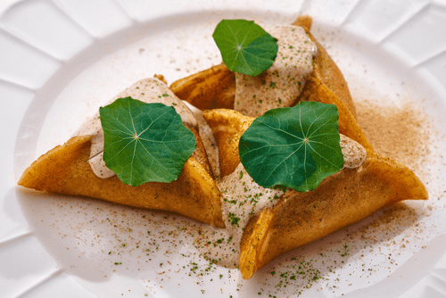 Add a little mushroom sauce to the center of each pancake, wrap it up, brush the edges with egg, and fold crosswise. The pancake samosa is ready!