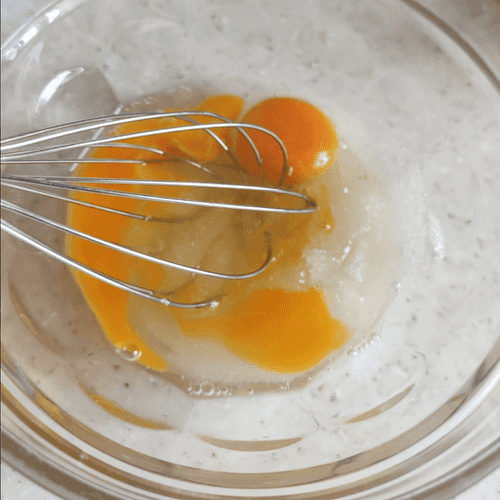 Beat the eggs with sugar and salt until fully dissolved.