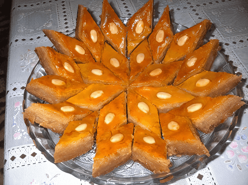 Cut the baklava into rhombuses measuring 10x4 centimeters, brush with egg yolk, and place a hazelnut or almond in the center of each rhombus. Bake for 40–45 minutes at 180–200 degrees. Meanwhile, prepare a syrup from a cup of powdered sugar and a cup of hot water. Pour the hot syrup over the finished baklava and return it to the oven for 7 minutes.