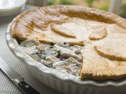 Form a pie from the prepared dough and fillings: separate a quarter of the dough for the pie's surface, roll out a round flatbread 1 - 1.5 cm thick from the remaining dough, place it in a greased mold or pan so that the edges are covered with dough, layer the fillings: rice, sliced eggs, sliced chicken, mushrooms. Roll out the lid, cover the pie, and make a hole in the center of the lid for steam to escape during baking.