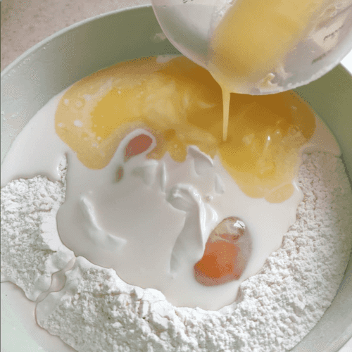 Sift the flour, make a well in it and add 2 eggs, milk (200 ml), sour cream, 1 teaspoon of salt, and melted butter (100 g).