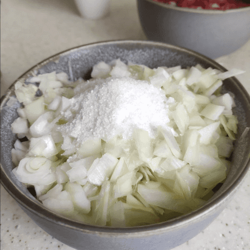 Transfer the chopped onion to a bowl, add 2 teaspoons of salt, and gently mash to release the juice.