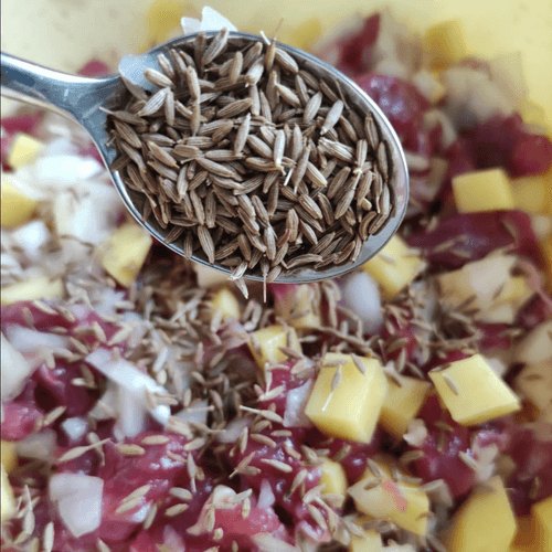 Mix potatoes, onions, and beef, adding 2 teaspoons of cumin.