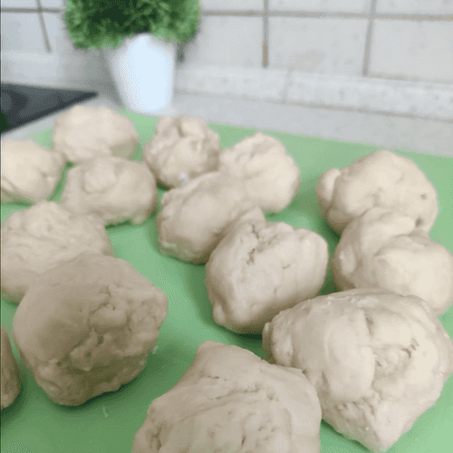 Take the dough out of the fridge and divide it into sixteen equal parts, forming small balls.
