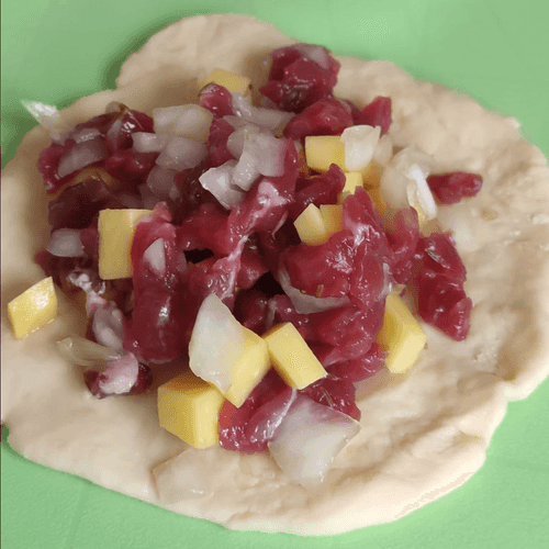 Place the filling in the center of the flatbread and start shaping the echpochmak.