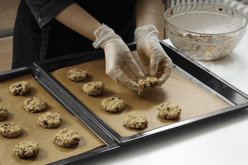 Use a large spoon to place cookies on the baking sheet. Each cookie is about 3 tablespoons of dough. A baking sheet can hold 12 cookies well. Bake for 20 minutes at 175 degrees.