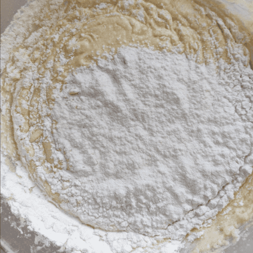 Add 1/3 flour to the oil mixture, mix, then add 1/3 sour cream and mix.