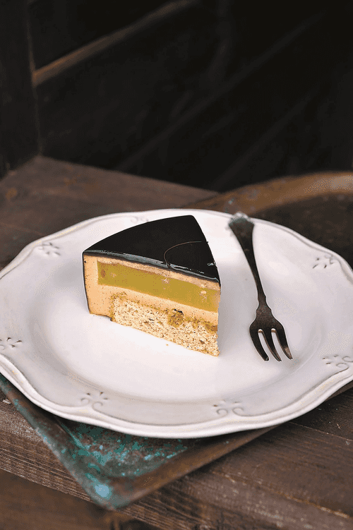 Finish assembling with the sponge cake (strezel side down), leaving 1-2 mm of sponge above the mousse surface. Freeze.