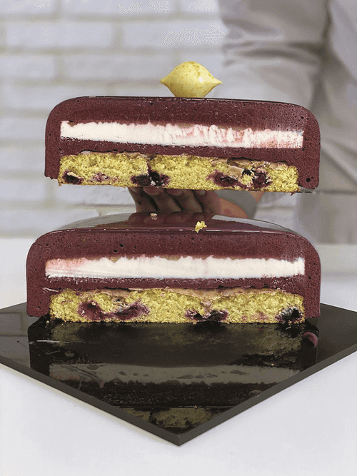 Fill two molds halfway with mousse. Place the frozen filling gel-side down and slightly submerge it in the mousse. Add the remaining mousse. Finish assembling with a biscuit (crunchy side down), leaving 1-2 mm of biscuit above the mousse surface. Freeze.